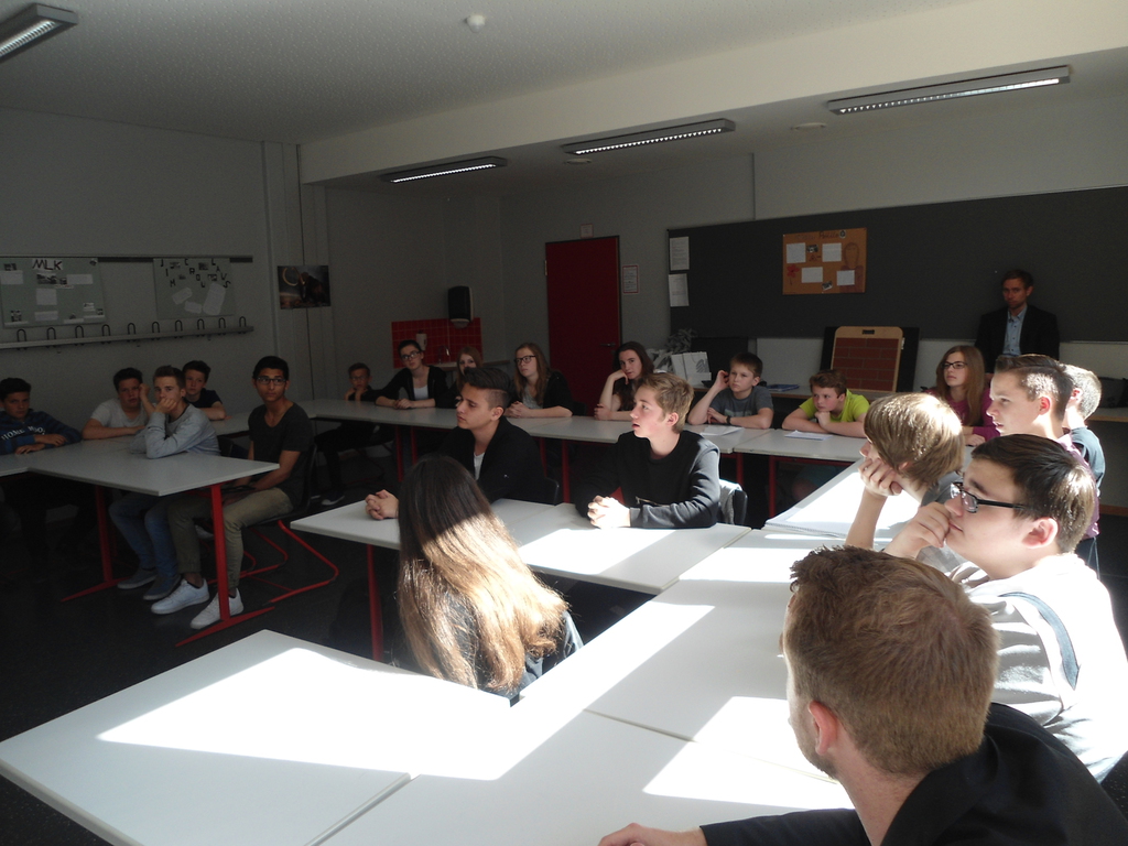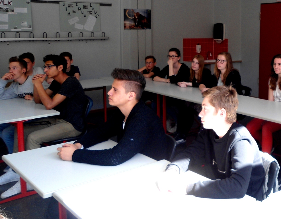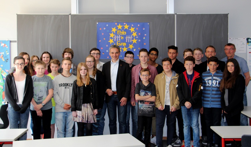 Anknüpfend an die Unterrichtsinhalte zum Thema Europa im Fach Gesellschaftslehre, erarbeiteten verschiedene Schülerinnen und Schüler der Jahrgangstufe 7 und 8 einen umfangreichen Fragenkatalog zu Aspekten der aktuellen europäischen Politik: „Wie viele Flüchtlinge kann Europa unter gegebenen Umständen aufnehmen?“ oder „Wie stabil ist die europäische Gemeinschaft, wenn auch anderen Staaten ein Schicksal wie Griechenland droht?“, waren beispielhafte Fragen, die die Jugendlichen interessierten. Wilfried Oellers verstand es dabei neben schülergerechten Antworten auch einen historischen Überblick über die Entwicklung Europas zu geben. „Wenn man in die europäische Vergangenheit blickt, so kann man das heutige Europa nur zu schätzen wissen“, sagte er. Diverse Kriege, Zölle und Passkontrollen gehörten nunmehr der Vergangenheit an, Europa lebe endlich in einer Gemeinschaft, in der man wechselseitig voneinander profitiert und zusammenarbeitet. Dieser positive Grundgedanke müsse unbedingt weiter gestärkt werden.