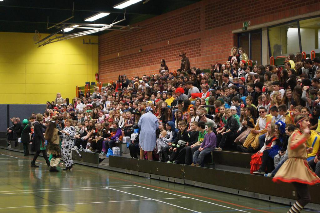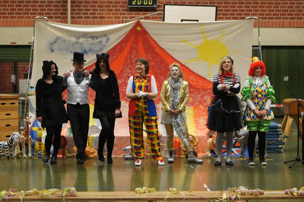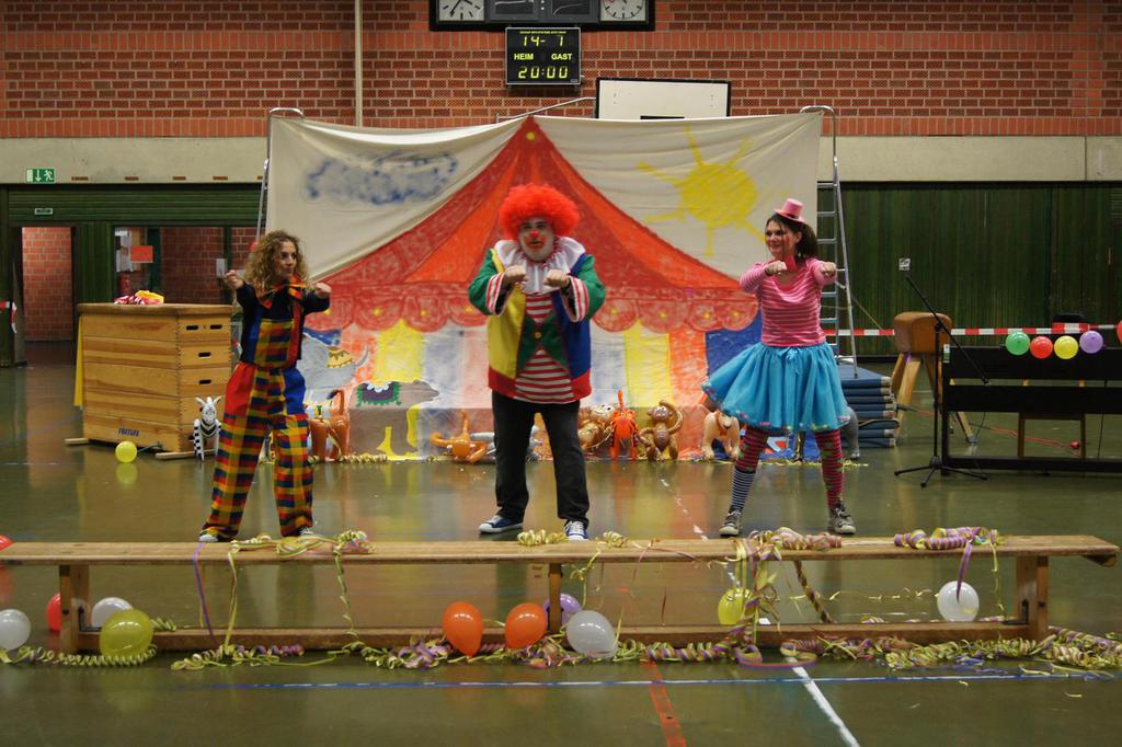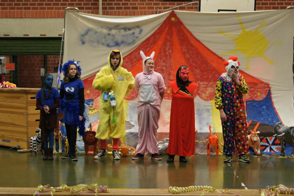 Am Altweiberdonnerstag um 10:11 Uhr war es dann endlich soweit. Die gesamte Schüler- und Lehrerschaft und die geladenen Gäste nahmen auf der Tribüne der Turnhalle an der Gesamtschule platz. Das Moderatorenteam bestehend aus der reizenden Zirkusdirektorin Yelda (Klasse 9) und dem Clown Leo (Benjamin Forg) führte durch die exzellente Show. „Wir haben wochenlang gearbeitet, jetzt ist der Moment, jetzt ist Party angesagt, los Leute auf geht’s!...“, motivierte Moderatorin Yelda noch einmal kurz vor Showbeginn alle Teilnehmerinnen und Teilnehmer hinter der Manege und sorgte damit für einen tollen Start. Jeder Jahrgang präsentierte unterschiedliche Act’s, die immer wieder für richtig gute Stimmung in der Turnhalle gesorgt haben. Der fünfte Jahrgang präsentierte gleich zwei Act’s! Die Tanzgruppe „5“ rockte die Halle mit einer eigens eingeübten Tanzchoreografie. „Leonardo’s Olympia Team“ unter der Leitung des Lehrers Dirk Heimanns präsentierte eine sehr lustige und zugleich technisch anspruchsvolle Turnershow. Geturnt wurde auch vom 6. Jahrgang, es wurden mehrere Arten des Spagats sowie ein Handstandlauf vorgeführt. Anschließend feuerte die Schülervertretung Kamelle aus allen Rohren, gestiftet von „frech“ dem besonderen Hauswirtschaftskonzept der Gesamtschule.