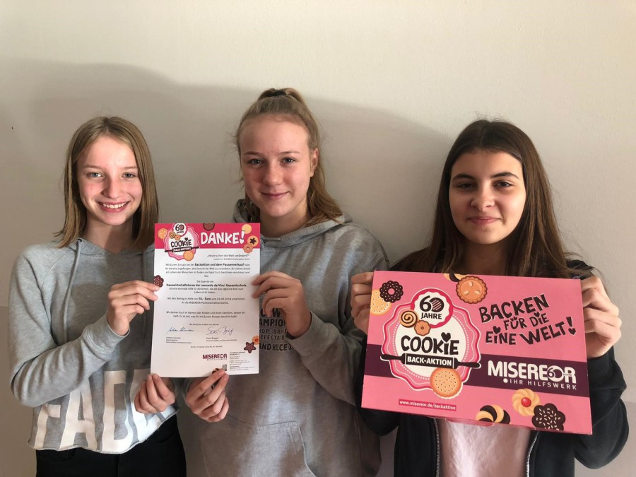 Wir, der Katholische Religionskurs der Jahrgangsstufe 8, unterstützten die Backaktion des Kirchlichen Hilfswerks Misereor. Kurz vor den Sommerferien war es soweit. Drei Schülerinnen brachten Teig von Zuhause mit. Während einige Schüler damit beschäftigt waren, Werbung zu machen, backten die anderen in der Aula Crêpes, die für einen kleinen Betrag verkauft wurden. Es kamen so viele Schüler und Lehrer, dass wir mit dem Verkauf kaum noch hinterherkamen. Wir haben 50 Euro eingenommen. Das Hilfswerk Misereor bedankte sich mit einem Brief bei uns. Für die Adventszeit haben wir eine weitere Backaktion geplant.