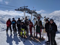 Unmittelbar nach der Ankunft wurde die Skiausrüstung abgeholt und eine Einweisung „Wie-ziehe-ich-die-Skiausrüstung-richtig-an“ folgte. Bereits hier flossen bei strahlendem Sonnenschein die ersten Schweißtropfen. Am nächsten Tag ging es endlich auf die Piste und es zeigte sich, dass einige sowohl aus den letzten beiden Jahren als auch von privaten Fahrten Erfahrungen im Skifahren gesammelt haben. Mithilfe der Ski-Lehrer konnten so bereits am Ende des ersten Tages die meisten Schülerinnen und Schüler einfache Pisten sicher fahren.