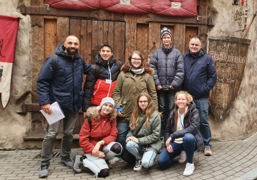 Natürlich standen neben den schulinternen Aktivitäten auch außerschulische Besuche auf dem Programm. Am zweiten Projekttag besuchten alle Teilnehmer die Nationalbibliothek in Riga, dessen Gebäude eine architektonische Meisterleistung darstellt. Erfreulicherweise fiel der Besuch auf eine Woche diverser nationaler Feiertage in Lettland, so dass die Bibliothek und auch der Rest der Stadt in den nationalen Farben angestrahlt wurde. Beim gemeinsamen Backen in einer traditionellen Bäckerei stellten die Schüler dann ihre Backkünste unter Beweis. Als Hauptattraktion der Fahrt stand dann der Besuch der Altstadt von Riga an, wo sich die Erasmusgruppe Deutschland zum mittelalterlichen Festmahl traf und sich im Bogenschießen übte. In einem Gebäude anno 1293 verzehrten die ermüdeten Reisenden bei Kerzenlicht und ritterlicher Bedienung lettische Speisen. „What happens in Riga, should not stay in Riga!", fasste man gemeinschaftlich zusammen und freut sich nun auf den Besuch der Delegationen, wenn es im Frühjahr heißt: „Willkommen in Deutschland!"