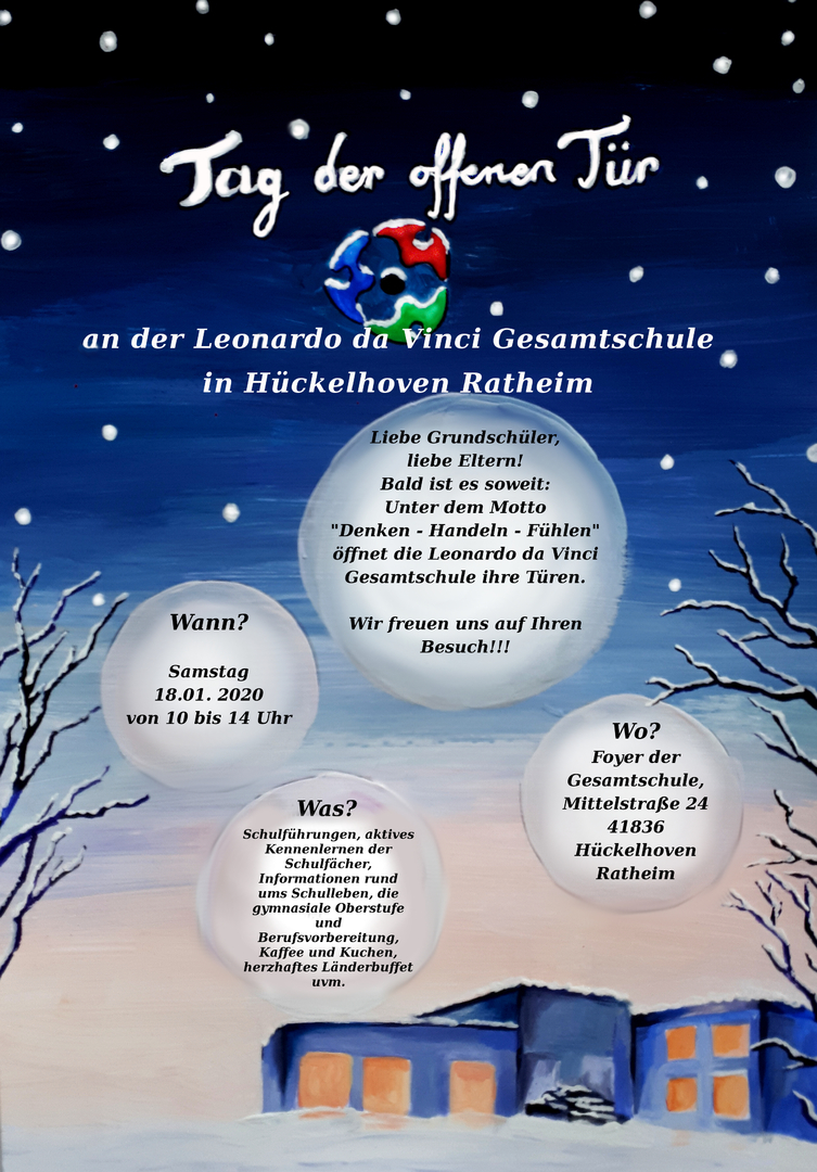 Kinder und ihre Eltern sind am Samstag, den 18.01.2020 von 10 bis 14 Uhr herzlich eingeladen, das Schulleben der Leonardo da Vinci Gesamtschule mit ihren vielfältigen Angeboten kennenzulernen. Neben Grundschülerinnen und Grundschülern spricht die Gesamtschule Hückelhoven bewusst auch Schülerinnen und Schüler aller anderen Schultypen an, die nach der zehnten Klasse die gymnasiale Oberstufe besuchen möchten. Beratungslehrerinnen und -lehrer der Oberstufe informieren gerne im persönlichen Gespräch und geben weitere Informationen.