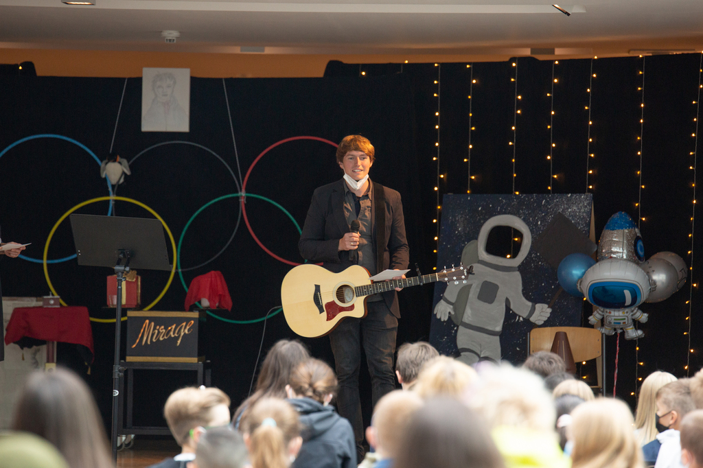 So konnten dann alle zusammen im Foyer Platz nehmen und gespannt warten, was nun auf der Bühne geschehen würde. Frau Rösgen und Herr Arregui begrüßten alle Anwesenden mit dem Lied „How Far I'll Go“, welches von der Entdeckerin Vaiana, aus dem gleichnamigen Film handelt und somit das Motto perfekt einfing.