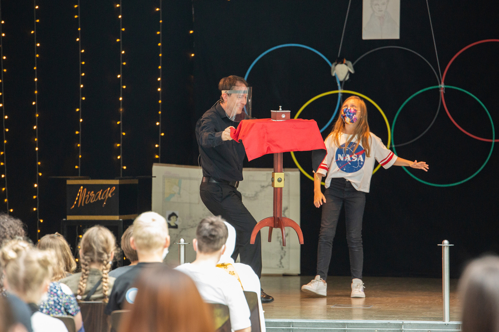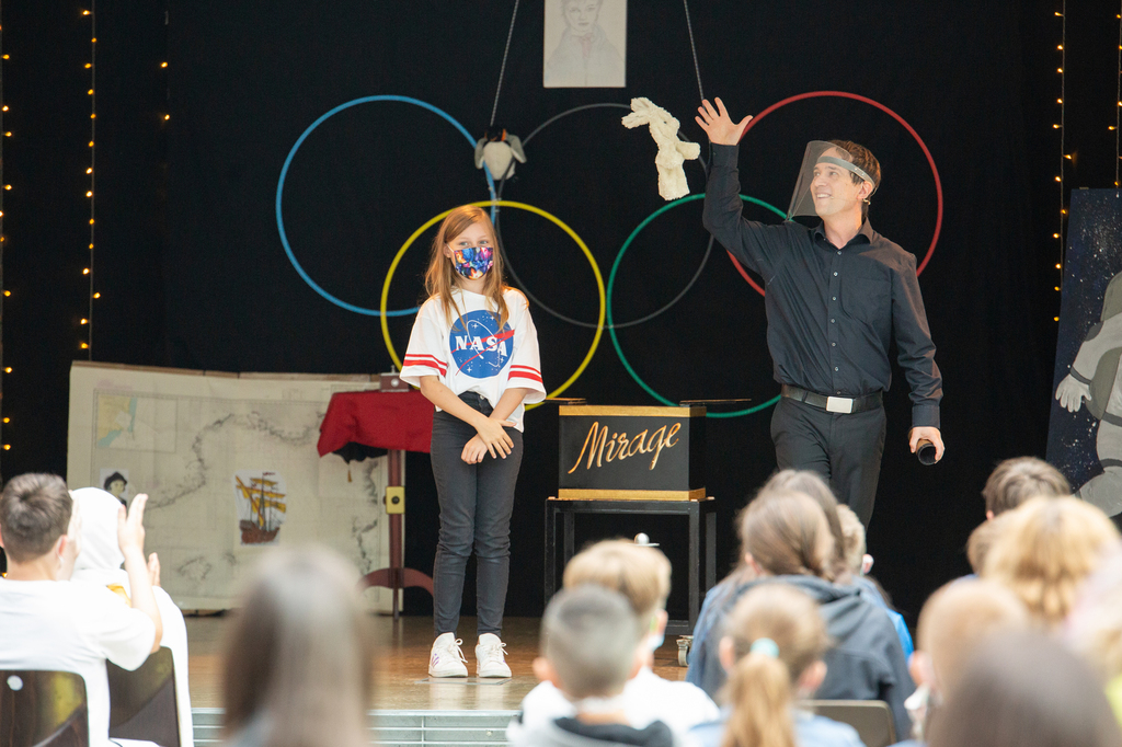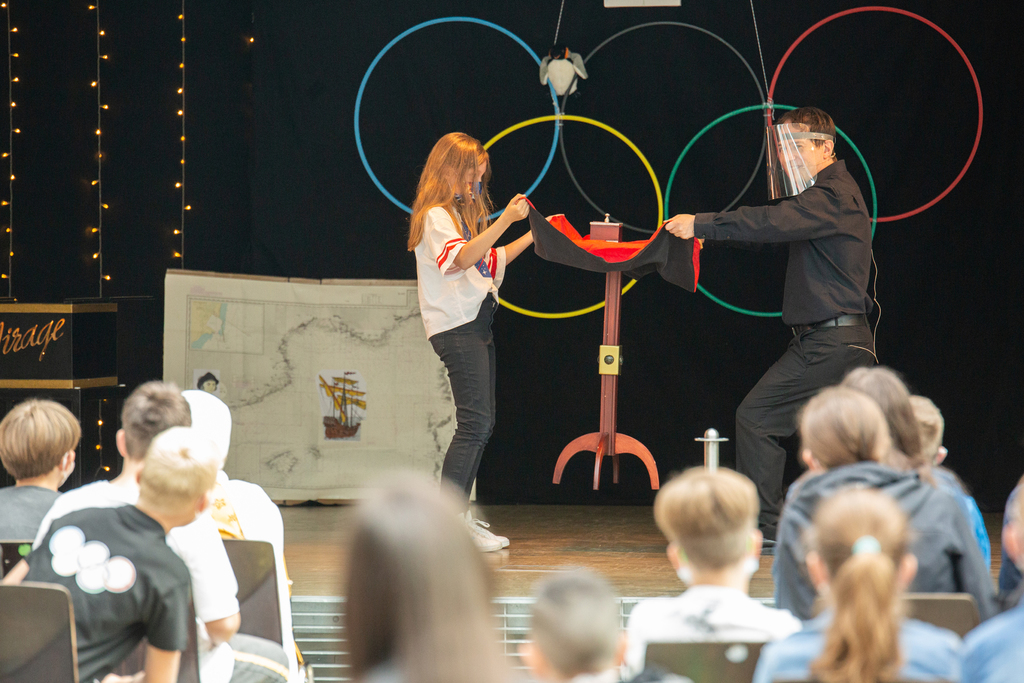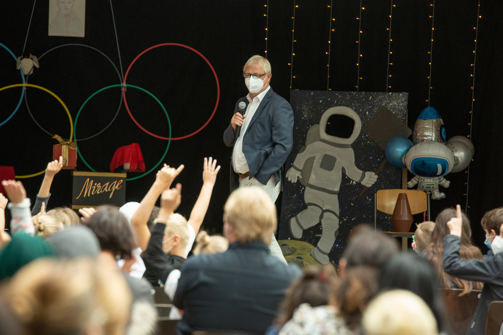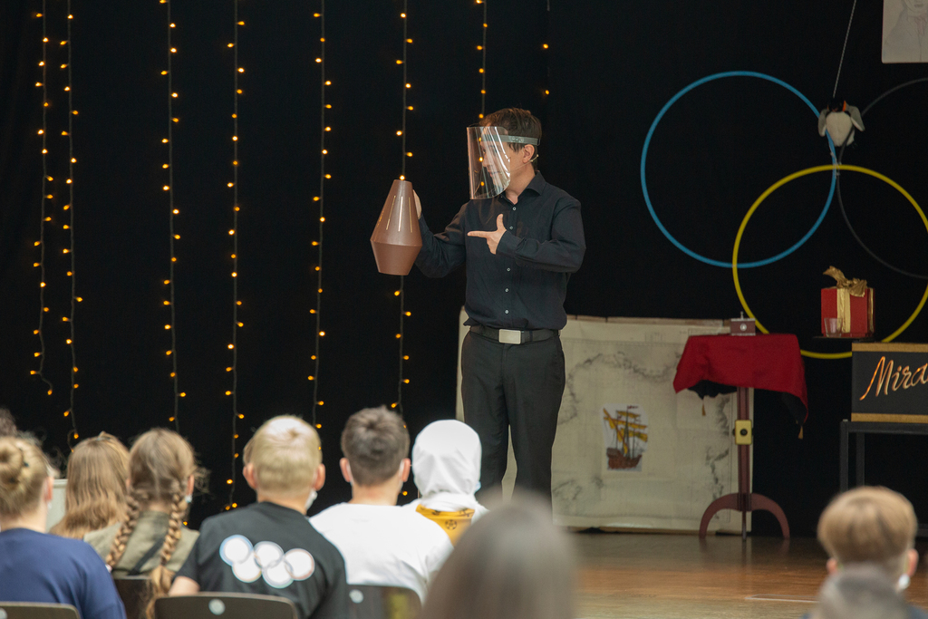 Weiter ging es mit einer Vorstellung des Zauberers Patrick Mirage, die durch Spenden des Fördervereins möglich wurde. Die kleinen Entdecker staunten nicht schlecht über den magischen Krug, der einfach nicht leer werden wollte und immer wieder echtes Aachener Zauberwasser zum Vorschein brachte. Ein Ring wechselte auf magische Weise den Platz und kam in einem Kästchen wieder zum Vorschein. Und wie war es möglich, dass eine neue Mitschülerin auf der Bühne auf einmal auch zaubern und einen Tisch schweben lassen konnte?!