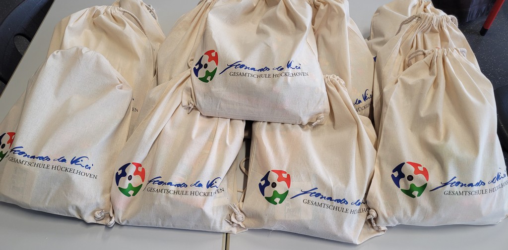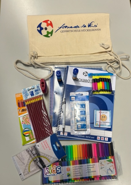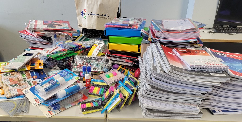 Es klingelt zur Pause, als das SV-Team sich am 6.4.2022 mit einem Stand im Forum der Leonardo da Vinci Gesamtschule bereit macht. Die ersten Schülerinnen und Schüler der Schule kommen aus den Klassen und bald werden die ersten Schnellhefter, Schreibblöcke, Stifte, Spitzer, Mäppchen, Lineale und zahlreiche andere Schulmaterialien abgegeben, die sie für ihre neuen Klassenkameraden besorgt haben.