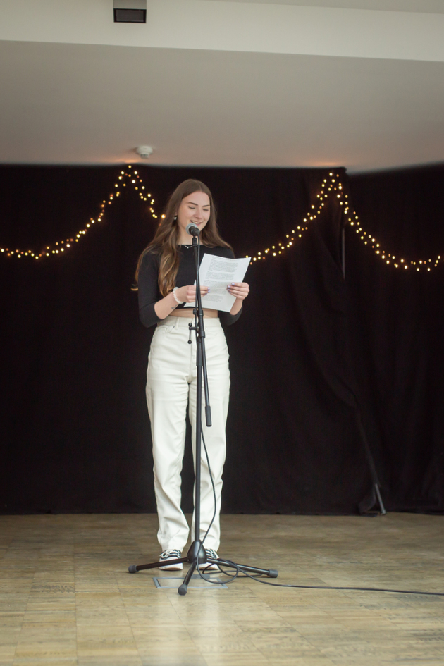Frau Kemper und Frau Kubitzki übergaben nach der Begrüßung das Mikrofon an Julia und Lisa, zwei Schülerinnen des Literaturkurses der Gesamtschule, die mit ihrer launigen Moderation durch den Abend führten und den Ablauf vorstellten. So sollten zunächst jeweils sieben Schülerinnen und Schüler ihre Poetry Slams in einer Live Performance vortragen. Die drei Besten jeder Schule würden sich für das große Finale qualifizieren. Bevor dieses steige, gäbe es noch drei „Video-Slams“ zu sehen. Zu jedem Slammer wurde ein „Fun Fact“ vorgestellt. So bezichtigten sich Geschwister gegenseitig für morgendliche Verspätungen verantwortlich zu sein, bezeichnete sich eine Slammerin als Verwandte von Goethe, wurde auf Erfolge in Online-Games verwiesen oder es traten der Mitarbeiter des Monats von „Macces“, sowie sein bester Kunde auf.