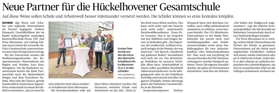 Diese Vernetzung von Schule und Arbeitswelt sei ihr gemeinsames Ziel, wie alle Teilnehmer der Veranstaltung in ihren Grußworten betonten. Darin waren sich die Teilnehmer Herr Hempsch von der Firma FAF in Hückelhoven Baal, Herr Arth von der IHK Aachen und Herr Leinders vom KURS Kooperationsbüro mit Schulleiterin Frau Mersmann und dem Berufswahlkoordinator Herrn Lennartz einig.