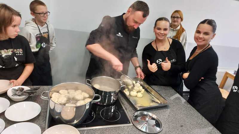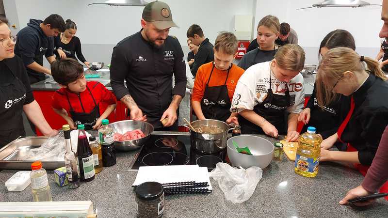 Im Rahmen von Sprachförderung fand in Kooperation mit der Tafel Hückelhoven und dem Jugendamt, vertreten durch Frau Tatjana Neumann, ein besonderes Event für ukrainische und deutsch-sprachige Kinder und Jugendliche an unserer Schule statt. Alexander Wulf, der als Sternekoch ein Restaurant in Erkelenz betreibt, hatte sich bereit erklärt, einen Kochkurs bei uns anzuleiten und ein typisch ukrainisches Gericht zuzubereiten. Herr Wulf ist selbst russisch-sprachig und konnte sich sowohl mit den ukrainischen als auch den deutschsprachigen Schüler*innen sehr gut verständigen. Die Mittel für diesen Kochkurs stellte freundlicherweise das Kommunale Integrationszentrum des Kreises Heinsberg zur Verfügung.